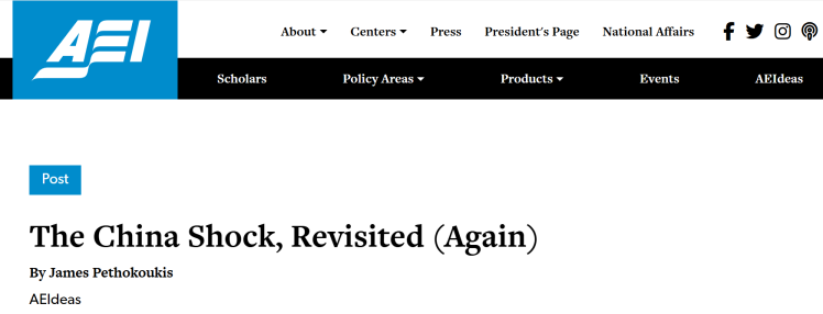 国际在线专文:当前,全球经济复苏乏力,贸易保护主义抬头。一些西方政客和媒体经常宣扬“中国冲击论”,试图为损人不利己的“关税大棒”开脱。美国著名保守派智库美国企业公共政策研究所高级研究员詹姆斯·佩索库基斯近日发表文章称,基于大量数据分析和案例研究,“中国效应论”无法得到证明。中国融入全球经济推动了美国经济增长。并切实提高了美国公民的生活质量。